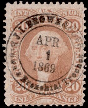 A Brown cancel on a twenty-cent Inland Exchange First Issue revenue, probably used on a promissory note.