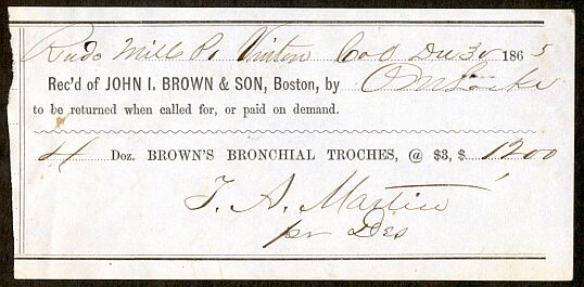 In 1865 John I. Brown & Son entered into a limited partnership arrangement with Jeremiah Curtis & Son known as Curtis & Brown, for the purpose of marketing medicinal preparations other than Brown's Bronchial Troches and Mrs. Winslow's Soothing Syrup, the leading Curtis product.