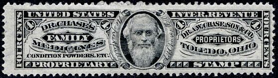 Doctor Alvin Wood Chase was a resident of Ann Arbor, Michigan, but his patent medicines were manufactured in Toledo, Ohio. They consisted, in part, of Dr. A.W. Chase's Kidney-Liver Pills, Dr. W.A. Chase's Ointment, the only unfailing cure for piles, salt rheum, eczema, scald head and all itchy skin diseases, Dr. A.W. Chase's Catarrh Cure, and Dr. A. W. Chase's Syrup of Linseed and Turpentine, a certain cure for asthma, bronchitis, sore throat, croup, coughs, colds and consumption in its early stages. Three stamps were issued for the company in 1877. 7,144 of the one-cent, 4,200 of the two-cent and 4,200 of the four-cent stamps were issued on silk paper, or, in the case of the one-cent stamp, some number of that total were issued on watermarked paper. The two- and four-cent stamps were not issued after1877, while the watermarked one-cent stamps were issued prior to October 1, 1880. Although the stamps were issued in small quantities many are known with full gum, indicating that few were used.