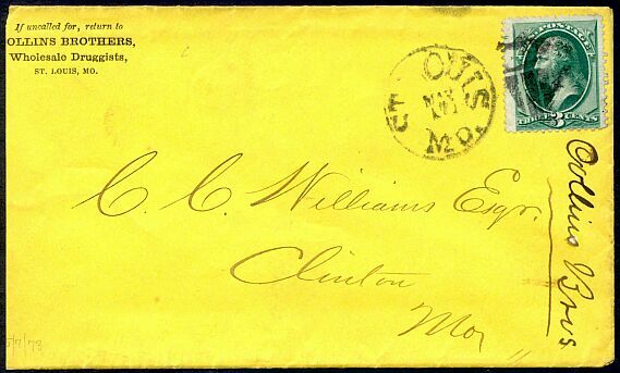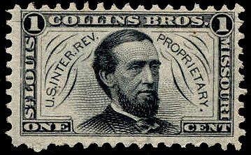 William H. Collins and Louis E. Collins are first mentioned as patent medicine wholesalers in Saint Louis in 1864. From 1867 at least through 1883 their business is shown as "patent medicines and druggists' fancy goods." Their private die stamp was first issued on January 2, 1867, and a second printing apparently took place in December, 1868, for a total of 231,000 stamps on old paper, only 196,900 of which were delivered. In September 1872 another 56,100 were printed, on silk paper this time, but most of these were not delivered. The copy above is on old paper.