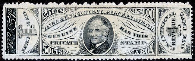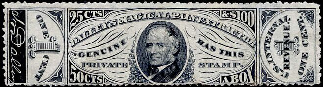 Stamps were first issued for Magical Pain Extractor in May of 1865, when it was discovered that there was no period in the upper right amount, making it $100 rather than $1.00. By August, Butler and Carpenter were able to correct this, and stamps were issued until March 1, 1883 with the correct amount - almost. Around the end of 1879 the American Bank Note Company decided to make a new plate, but used the error die in doing so. Any copies printed from this plate show the original error.