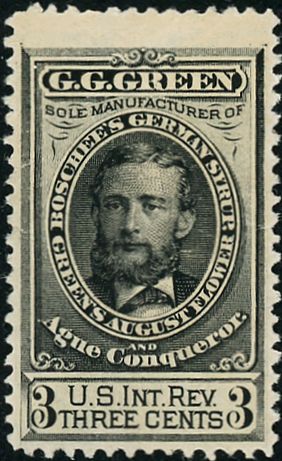 G.G. Green's primary products were Boschee's German Syrup for diseases of the throat and lungs, Green's August Flower to treat things like dyspepsia and pain in the side, and Green's Ague Conqueror for malaria, chills and fever, and the worn-out feeling. The firm was in no hurry to have private stamps prepared, but in May of 1878 the first were issued. The final ones were issued in April of 1883. 5,074,630 were printed, all on watermarked paper. At some time a delivery of rouletted copies was made, but the number perforated that way is unknown.