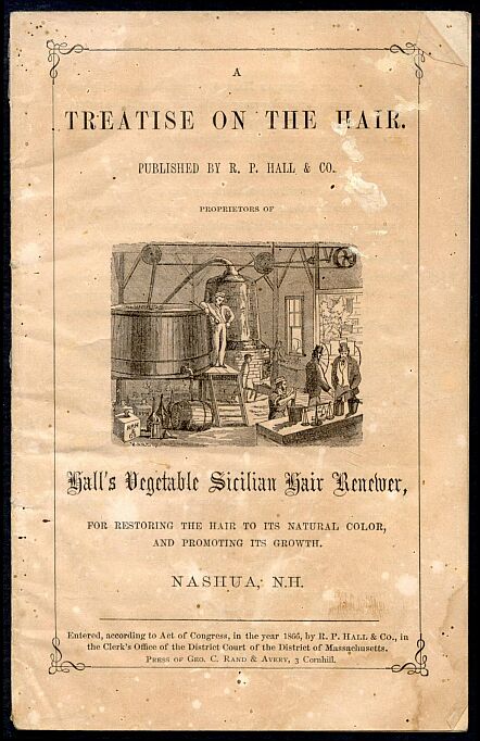 A Treatise on the Hair copyrighted by R.P. Hall & Co. in 1866. Inside it claims, "In order to protect the public from deception, we have secured the protection of the UNITED STATES GOVERNMENT, who furnish us with a PRIVATE REVENUE STAMP, one of which is placed over the top of each bottle.... All that do not have the above-described stamp on are BASE IMITATIONS."