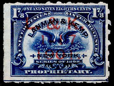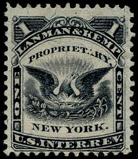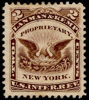 The Lanman & Kemp firm began in the 1830's and flourished for the rest of the century. They were wholesale druggists, and manufactured some toiletries as well. During the Civil War tax period their private die stamps were used on perfumes and the like. The one-cent stamp was issued from March of 1864 until June 5, 1883. 1,732,040 were printed on silk paper and another 2,813,190 on pink and watermarked papers. This one was printed on silk paper.