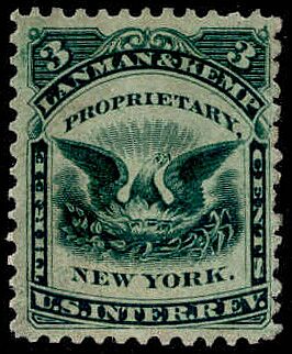 The 1 1/4 cent stamps paid the tax on a fifty-cent article, and the 1 7/8 cent stamp on a seventy-five cent item. Holcombe reports that 20,000 of the former were printed, and 80,000 of the latter. If this is correct they are not difficult to find, considering how few were printed.