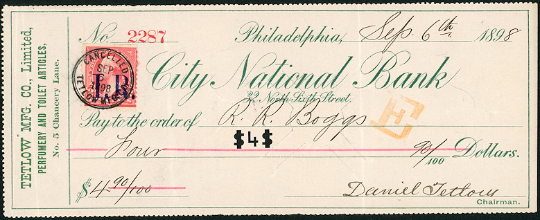 An 1898 check from the Tetlow Manufacturing Company, formed by Daniel Tetlow when he split off from his older brother, Henry, in the mid 1880s. The brothers' firms were in competition with each other well into the Twentieth Century.