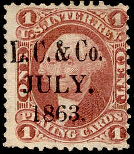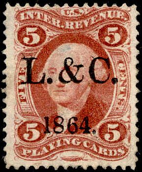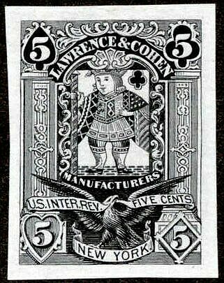 Lawrence and Cohen used First Issue playing card stamps prior to August of 1864. At that time the tax was one cent per pack up to 18 cents in cost, two cents to 25 cents, three to 30, four to 36 and five cents over 36 cents in cost. After August five cents would have been useful only in multiples until that became the rate per pack in August of 1866. The copy above was probably used in early 1864.