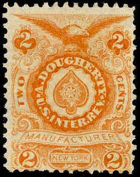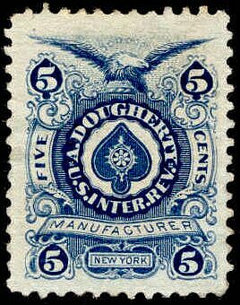 Two printed cancels of the Andrew Dougherty company on general issue revenue stamps. The second one is an experimental roller cancel.