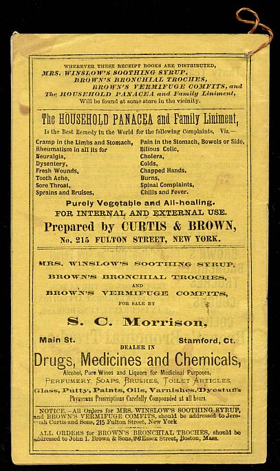 The back page shows that Curtis & Brown was an active company for one of the products as well. At the bottom in the small print it says that "All orders for Mrs. Winslow's Soothing Syrup, and Brown's Vermifuge Comfits, should be addressed to Jeremiah Curtis & Sons, 215 Fulton Street, New York." Also, "All orders for Brown's Bronchial Troches, should be addressed to John I. Brown & Sons, 26 Essex Street, Boston, Mass."