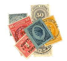 In the Scott Specialized Catalog of US Stamps and Covers the items with R prefixes are revenue issues. The numbering system runs from R, RB, RC to RZ, with a few gaps and a few insertions, such as RVB (the Federal boating stamps of the early 1960's). This website is an expanded version of one prepared for the eBay Users Stamp Club and is meant to provide a brief overview of each of the Scott-listed revenue categories as of the year 2000 Catalog. The history of adhesive revenue stamps in the US essentially begins with the Revenue Act of 1862, when the North began to tax a vast number of items to finance the Civil War effort. Scott lists embossed revenues (plus several typographed and engraved items) from the colonial period and the early years of the country as well. Numbers from R1 through R734 are almost all documentary revenues. However, R1 through R102, the solid-color revenues printed from 1862 to 1871 known as the First Issue, include proprietary stamps as well. Here are three First Issues, an imperforate, a part-perf pair and a perforated stamp. The imperforate, a one-cent express, was probably issued that way, as it has four wide margins and was used in 1863, an appropriate time. It was issued to pay a short-lived tax on express shipments. The telegraph stamps in the center were to be used on telegrams. The playing card stamp was one of the proprietary stamps included with the First Issues and could not legally have been used to pay any sort of documentary tax. This document is a promissory note written at the office of the Quincy Mining Company in Michigan on February 13, 1863. The stamp is an imperforate sixty-cent Inland Exchange First Issue, one of a very small number known to exist on document. The tax rate from October 1, 1862 to March 3, 1863 was sixty cents on amounts over $1,000 to $1,500. This is a precancelled one-cent First Issue proprietary stamp used on an Arnica Body Plaster by Wm Holloway & Co in 1871. In 1871 the designs were changed to blue and black (or multi-colors, in the case of the $200 and $500 "Persian Rugs) to avoid rewashing and reuse. The uniform colors apparently confused lawyers, so some values were printed with frames in other colors fairly quickly thereafter. These are the Second and Third Issue stamps, R 103 - 150. The stamp at left is a Second Issue, and the one at right is a Third Issue. First Issue stamps continued to be valid after the Second and Third Issues were produced, and this document has an example of each. They pay the tax of five cents per hundred dollars on a promissory note, which was the rate in 1872. There were several more Civil War documentary stamps before the taxes were repealed in 1883, but the next major period for stamp taxes was 1898-1902. When the Tax Act of 1898 was passed to help finance the Spanish American War there was not much time to put together the necessary stamps before its effective date, so provisional overprints on postage stamps were prepared, R 153 - 160. The series of low values of the regular issue bore the picture of a battleship, R161-172, while higher values featured Commerce and portraits, R173-194. These were used until 1902. This bond to cover "honesty and fidelity in the position of motorman" was taxed fifty cents under the Tax Law of 1898, and as it was considered to be a form of insurance, the tax of one-half cent on each dollar of premium was collected as well. The fifty and the half-cent stamps are from the documentary series known as "battleships" and the one-cent is a postage stamp with a provisional IR overprint. Documentary stamps of other designs were used from 1914 until 1967. Two of the most common designs are the workhorse 1917 low value and the "dated reds" that ran from 1940 to the end. The following three documents illustrate uses of the later documentary stamps. This promissory note is an example of the 1914 issue as a first-day use. A ten-cent stamp of the 1917 issue was used to pay the proxy tax on this stock proxy of the Mother Lode Copper Mines of Alaska. A somewhat unusual use of "dated reds" (in this case without overprinted dates) is found on this 1959 reinsurance agreement between Lloyd's of London and the Marine Midland Corporation et al of Jersey City. The documentary taxes paid on the transaction were $3012.72. The RB issues are Proprietary stamps, intended for use on matches, perfumes, patent medicines, playing cards, and other taxed proprietary items. Those from 1862 to 1871 are included under the First Issue R's, as mentioned, but the proprietary Second Issue is RB 1- 10. There was a return to solid colors for 1875-81. The Spanish American War RB's feature battleships, the 1914 issues are gray, and the 1919 ones are blue. There were no later issues. It is much more difficult to find the earlier proprietary revenues "on piece" than it is to find the documentaries "on document" for obvious reasons. This is an example of a Third Issue proprietary stamp on part of a medicine wrapper. Note that the stamp has a printed cancel of the company name and location. This is a label from Professor Horsford's Remedy with a Spanish American War "battleship" proprietary stamp. Austin's Medicated Corn File and Foot Comfort came in a container so small that it barely had space for the battleship proprietary. RC's are Future Delivery tax stamps used for contracts for future delivery of any merchandise. They are overprinted documentary issues, and were used from 1918-34. Here they are used on a card for purchasing grain futures. Note that the tax rate is spelled out at upper right. The stamps received perforated cancels after they were put on the document. RD's are Stock Transfer stamps. The early issues were overprinted documentary stamps. The "dated greens" began to be issued in 1940. Stock transfer stamps of one sort or another were used from 1918-1952. This document was used to transfer ownership of 33,273 shares of Stutz Motor Car Company in 1929, incurring $665.46 in documentary tax