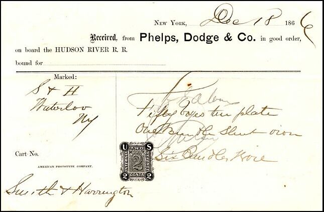 A receipt for shipping tin plate and sheet iron on the Hudson River Railroad in 1866. Although the tax on such receipts had been removed as of August 1 that year it may have been simpler and more economical not to turn the documents in to get a refund of the prepaid tax.