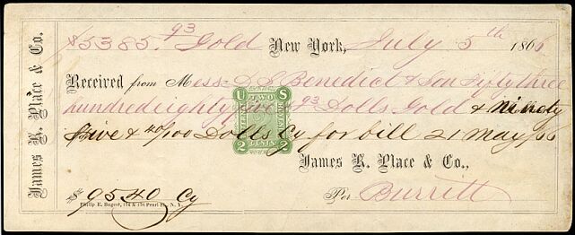 A receipt of James K. Place and Company showing that they had been paid $5,385.93 in gold and $95.40 in currency.