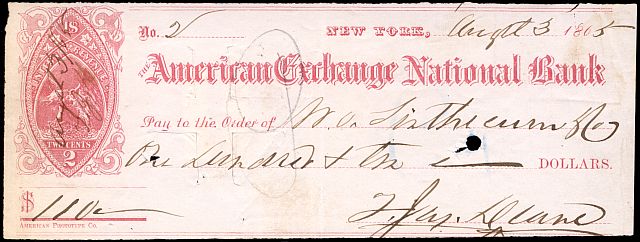 This is an earliest known usage of revenue stamped paper on a check so far as the day of use is concerned. At least one other example is known used on the same day, but it isn't numbered. It was fitted against the top of this copy to see that it matched in order to prove it was indeed number one.