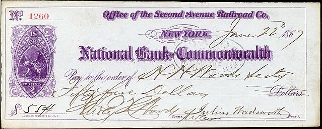 A handsome check of the Second Avenue Railroad Company. It's rather a pity that American Phototype was not allowed to continue printing checks and imprints in a single color.