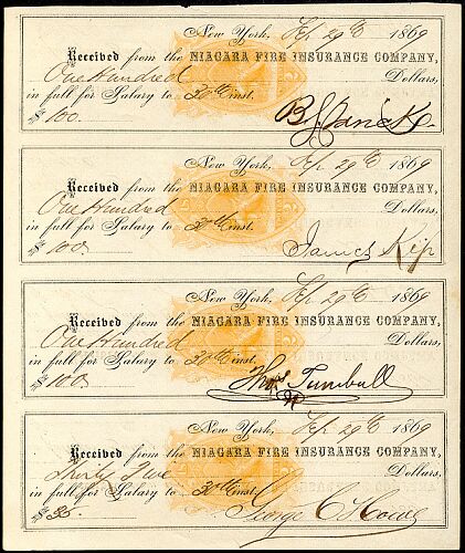 This is a full page of two-sided receipts from the Niagara Fire Insurance Company. Note that the imprint is turned sideways to allow four per page.