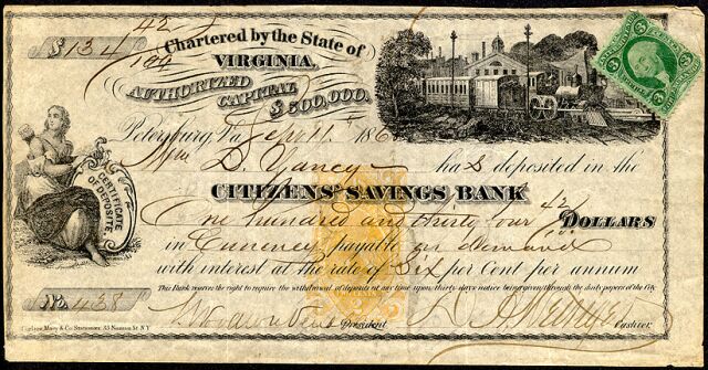 A certificate of deposit from Petersburg, Virginia. As the amount deposited, $134.42, was over $100 the tax was five cents, so a three-cent adhesive revenue was added.