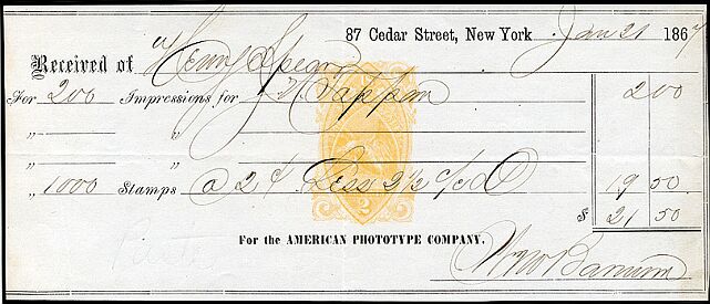 This is one of several types of receipts used by American Phototype. It shows payment for imprinting 1,000 stamps, with a 2½% discount.