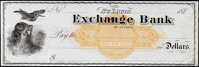 A silly-looking spaniel with a snipe flying overhead graces this unused Saint Louis check with a C21 imprint. |