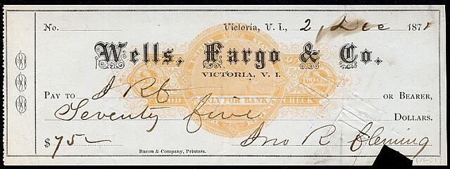 This used check was issued in Canada, but apparently the expectation was that it would be cashed in the United States. The missing portion is the result of a normal cut cancel, placed low. |