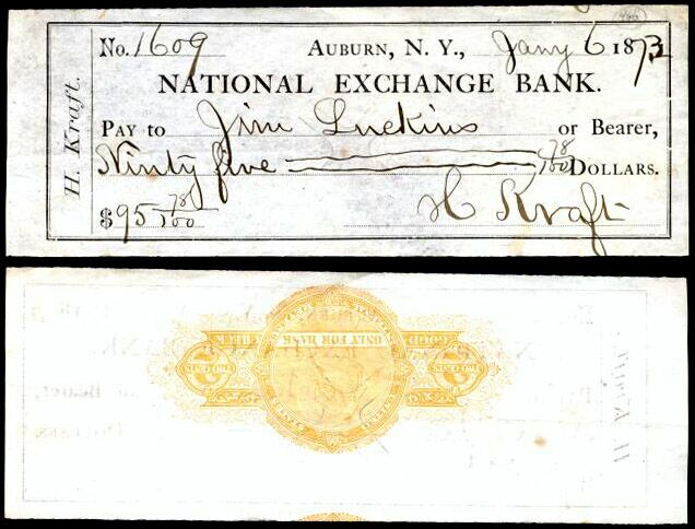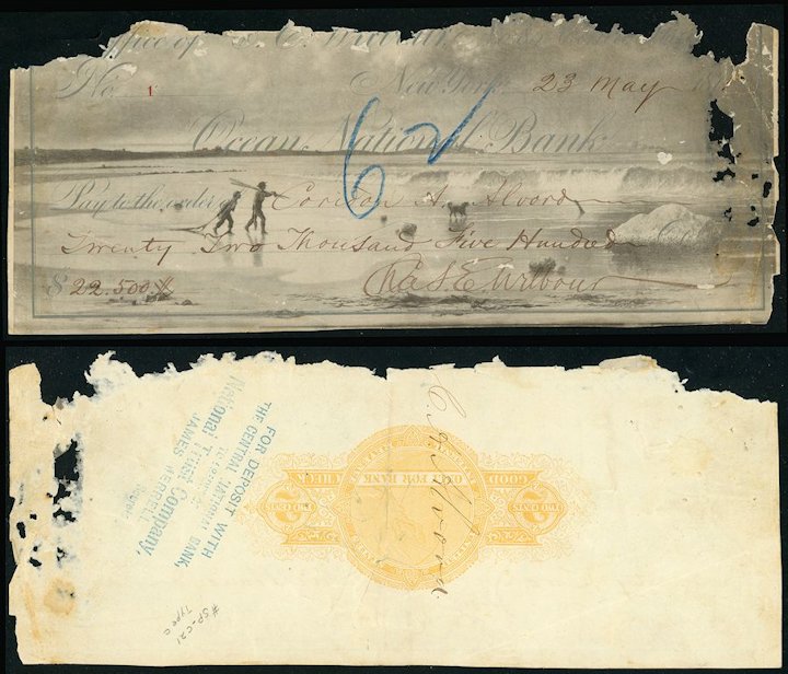 Tattered as it is, this check is one of the most unusual known from the late 1860's or early 1870's. The overall design on the front is extraordinary, and the text is printed in a silvery ink. The imprinted revenue would be out of place on the front of it.