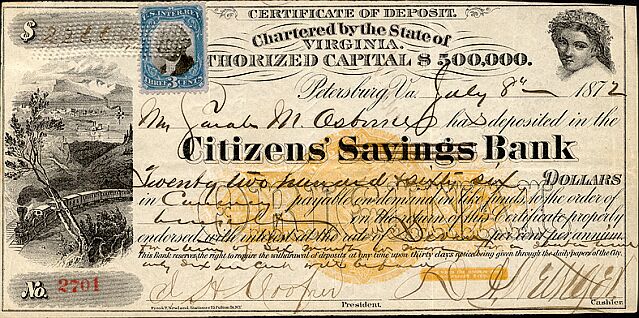 This copy was used to deposit more than $100, so a second issue documentary revenue was used to pay the additional three cents of tax.