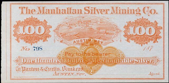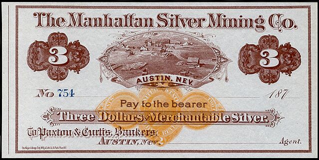 Manhattan Silver Mining Company 'scrip' is actually a series of bearer checks payable on the Paxton and Curtis bank, as private scrip was illegal in Nevada when they were issued. These checks exist in denominations of $1, $3, $5, $10, $20, $50 and $100. |