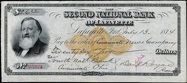 An engraved draft originating in Lafayette, Indiana, drawn on a bank in Cincinnati. |