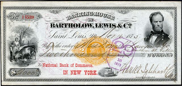 This engraved draft was used by Bartholow, Lewis & Company of Saint Louis to draw on funds held at the National Bank of Commerce, New York. |