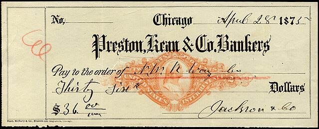 J imprints are not known for many users outside of the Eastern states. Preston, Kean and Company of Chicago used both J4 and J11 on their checks. |