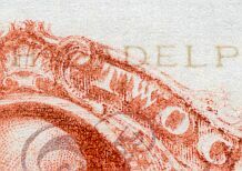 A detail of the imprint. Doubling is particularly noticeable in the "W" of "TWO."