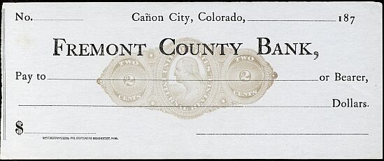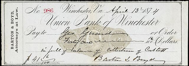 The imprint on this check is listed as K4, gray, in the Castenholz Field Guides to Revenue Stamped Paper. Bill Castenholz warns that there are what he calls "color changelings" that might be mistaken for other shades. Eric Jackson maintains that the color is olive, and that the imprint is a K11. I lean toward calling it gray. |