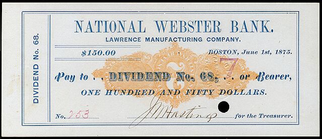 The dividend check printer or printers for the Lawrence Manufacturing Company created four interesting errors. In addition to three or four of these inverted Type N's, they are responsible for the D1 and C21 inverts and the M2's on the back of checks.