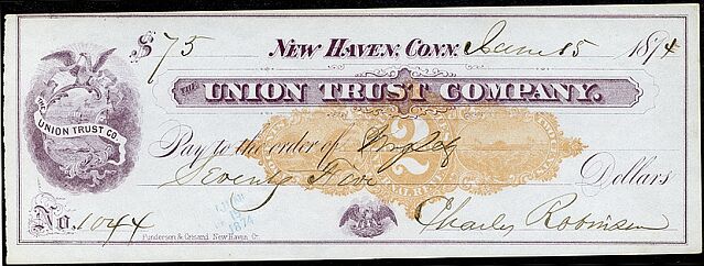 N imprints in brown are only known on checks of the Union Trust Company of New Haven, Connecticut. Some orange imprints look almost brown, but do not survive the red lens test.