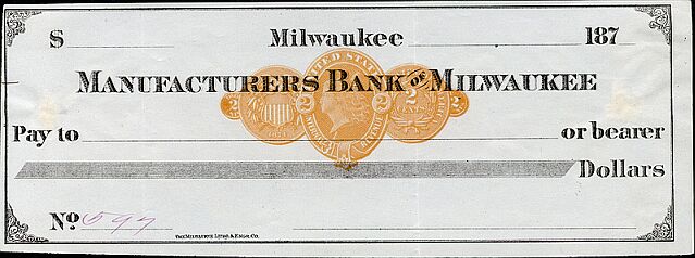 Unused checks with O2 imprints are most common (perhaps a dozen copies, perhaps a few more) from Chicago. Several are known from Milwaukee as well. |