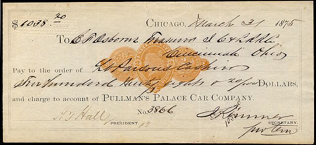 Before the discovery of 56 used checks with O2 imprints from Iowa there were only three known used copies. This is one of the three. However, another used copy of this Pullman Company draft can be found in the Smithsonian, not counted in the three. |